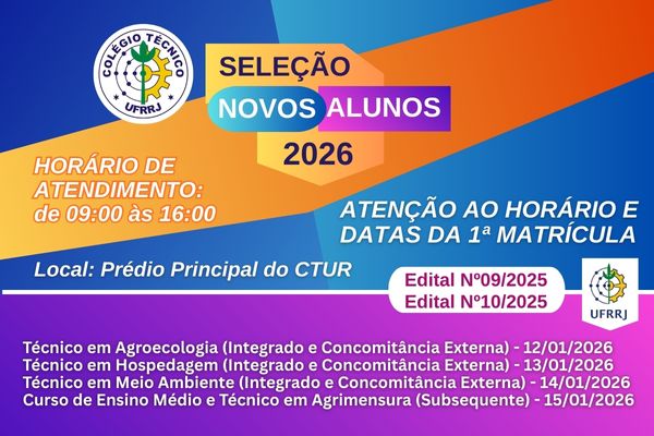 A direção do Colégio Técnico da UFRRJ informa o local, horário de atendimento e datas de realização da 1ª matrícula leia mais