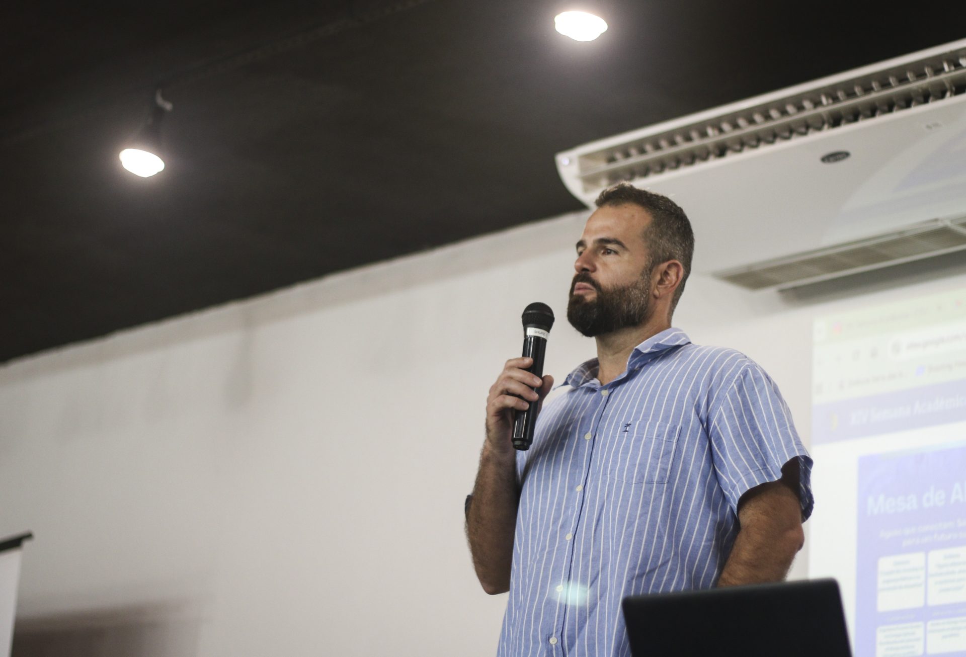 A mesa de abertura foi mediada pelo professor e coordenador do curso de Meio Ambiente, Rafael Albieri, e contou com a presença dos seguintes convidados: Cláudia Moster, engenheira florestal e doutora em Ecologia Aplicada, coordenadora do Laboratório de Manejo de Bacias Hidrográficas; Cássio de Almeida Pires, geólogo e mestre em Hidrogeologia, fundador da empresa Geohídrica; e Gustavo Henrique Soares Guedes, doutorando em Biologia Animal.